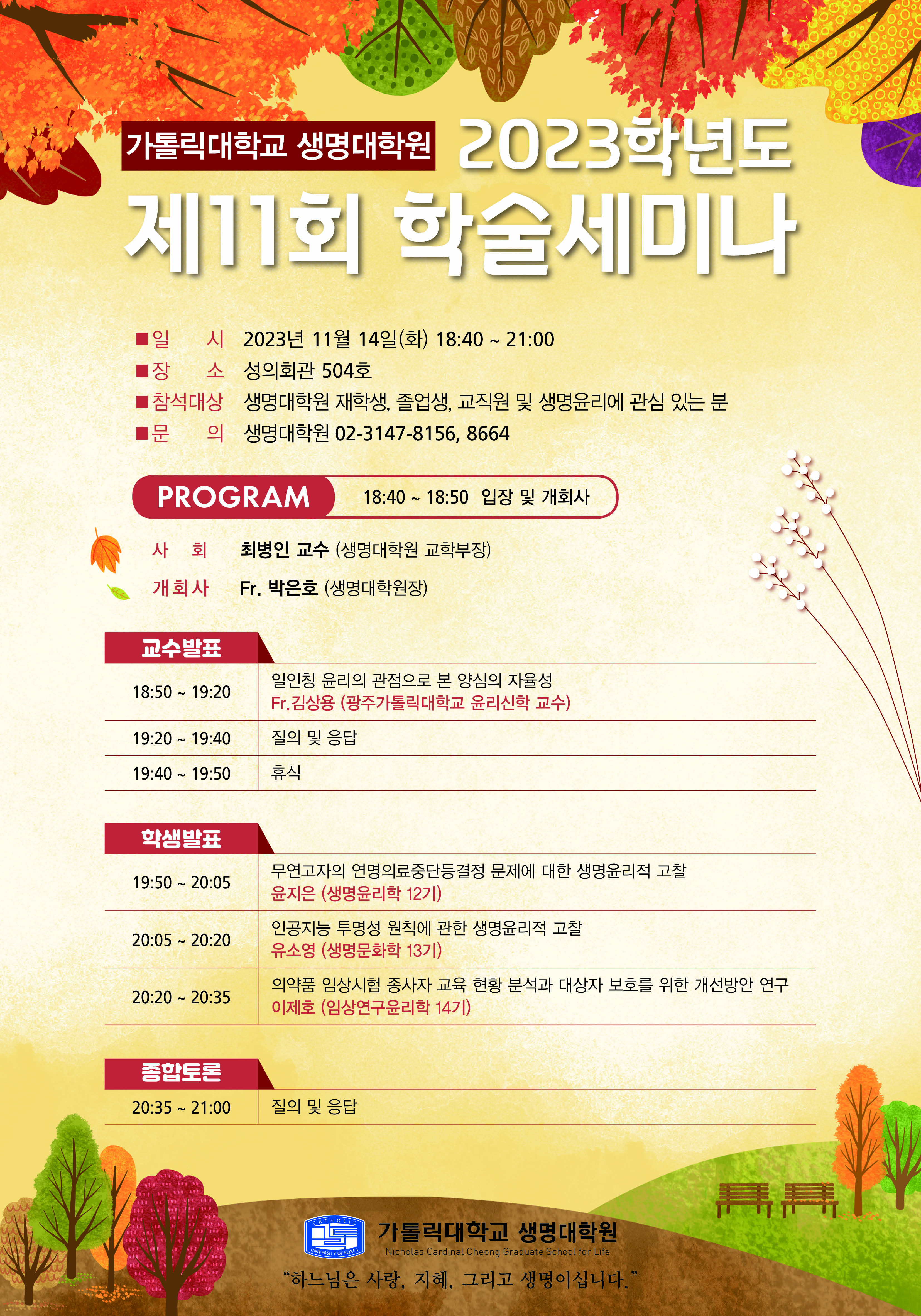 가톨릭대학교 생명대학원에서 제11회 학술세미나를 개최합니다. 관심 있는 분들의 많은 참여를
